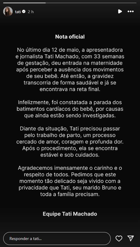 Segundo a nota, a gestação transcorreu normalmente até então. Diante do quadro, a jornalista passou pelo trabalho de parto e segue em recuperação, cercada de apoio médico e familiar.